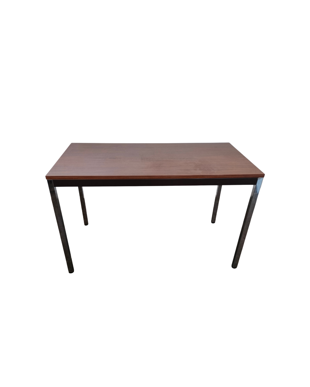 Bureau droit coloris bois foncé avec piètement métal aluminium, dimensions L120 x P60 x H74 cm. Fonctionnel et robuste, il offre un espace de travail compact et élégant, idéal pour un aménagement professionnel optimisé et contemporain.
